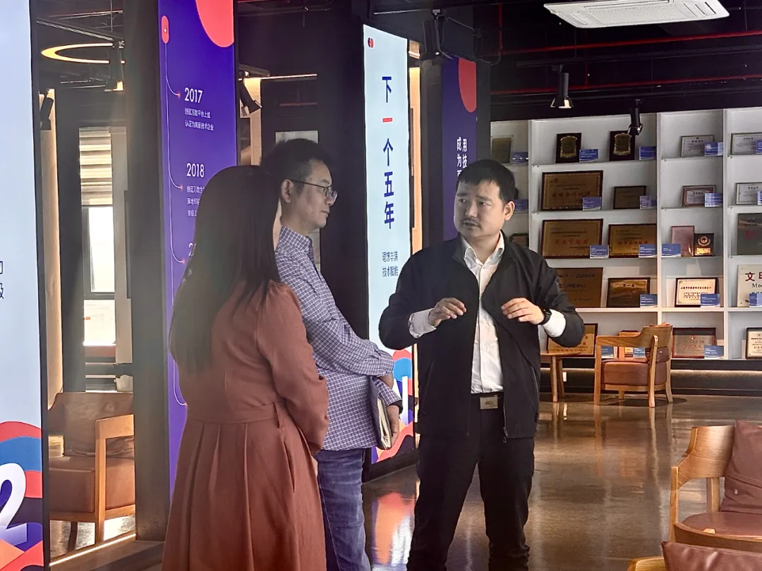 走访过程中,调研组先后参观了主营业务展示区、荣誉墙以及企业文化价值观等展板,全方位了解创蓝云智的业务范畴、发展历程及企业精神。在董事长唐小波的讲解下,调研组深入了解了创蓝云智的经营现状、核心竞争力以及行业发展趋势,同时对创蓝云智在行业内取得的成就给予高度评价。