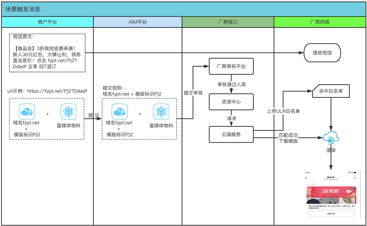 区别在于接收短短信之后会在终端手机中做一次解析,这个解析逻辑主要是看短信中url是否命中url白名单,如果命中则就去服务端再拉取一次富媒体卡片消息内容