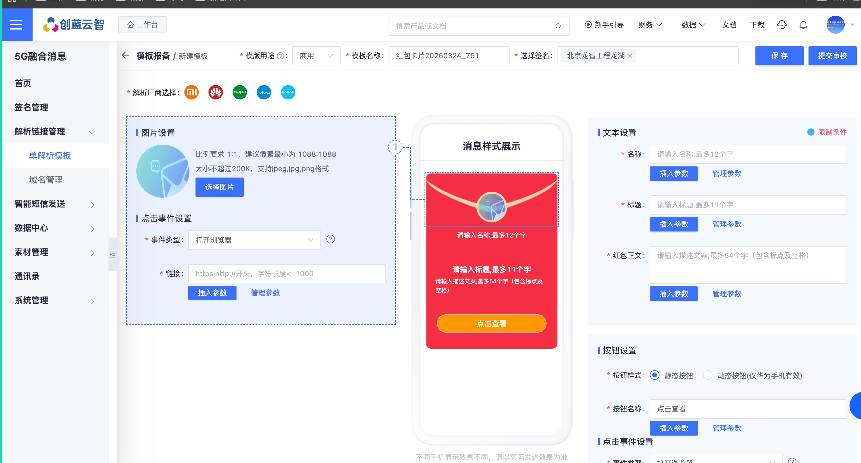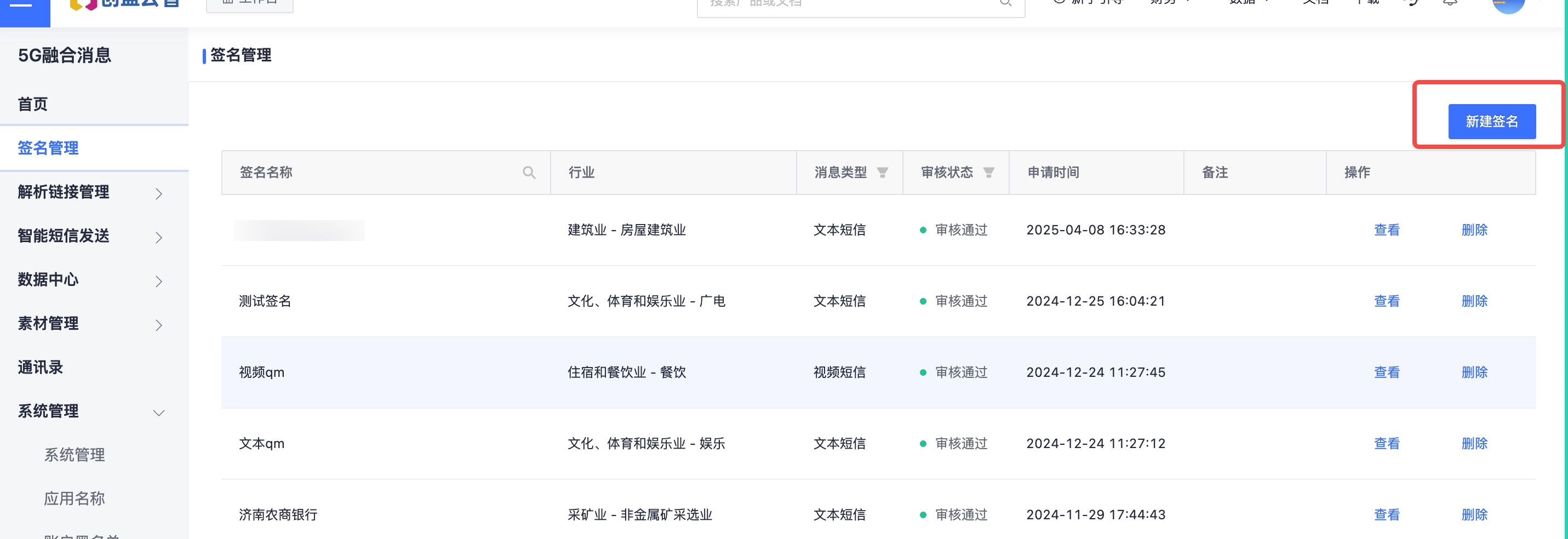 点击【新建签名】,根据公司实际情况,填写对应的签名名称、所属行业、详细资料,填写完后点击【保存】,等待运营商审核,如下图所示: