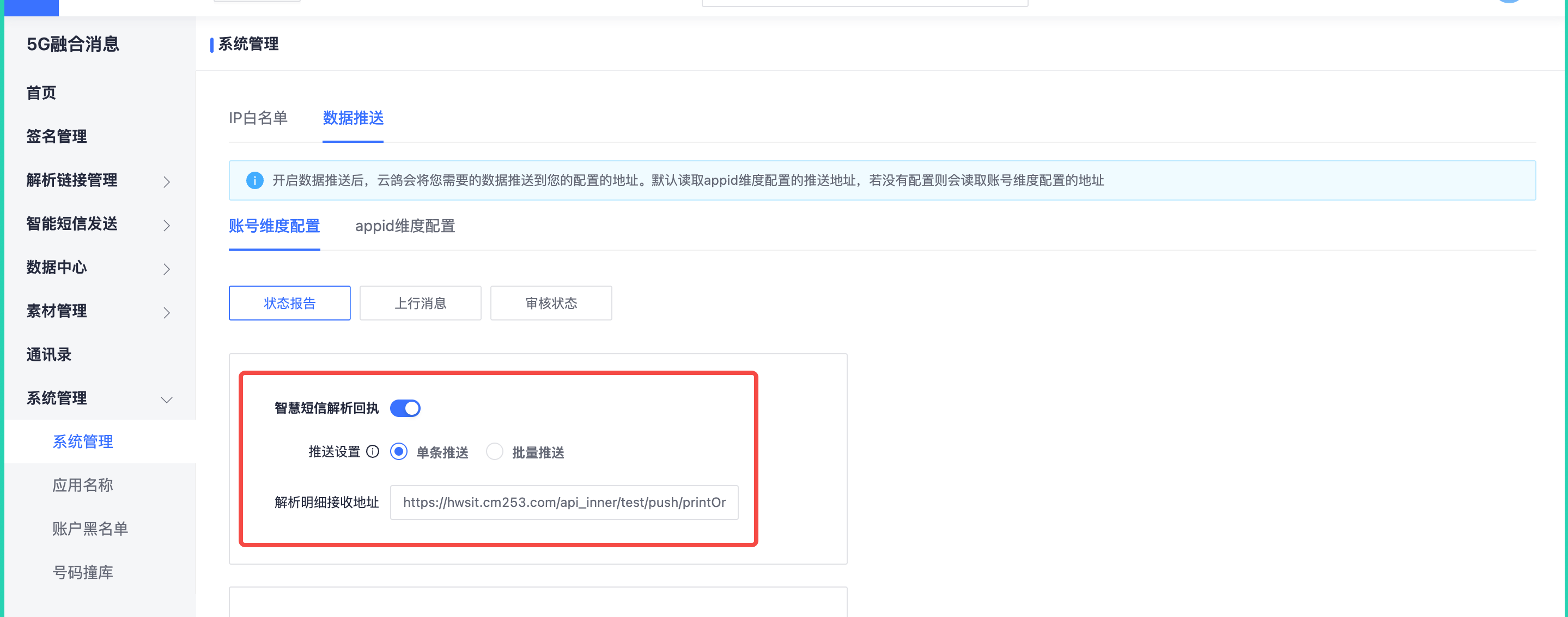 开启【数据推送】,可以配置回调地址,将发送明细和解析明细进行推送。开启数据推送后,云鸽会将您需要的数据推送到您的配置的地址。默认读取 appid 维度配置的推送地址,若没有配置则会读取账号维度配置的地址