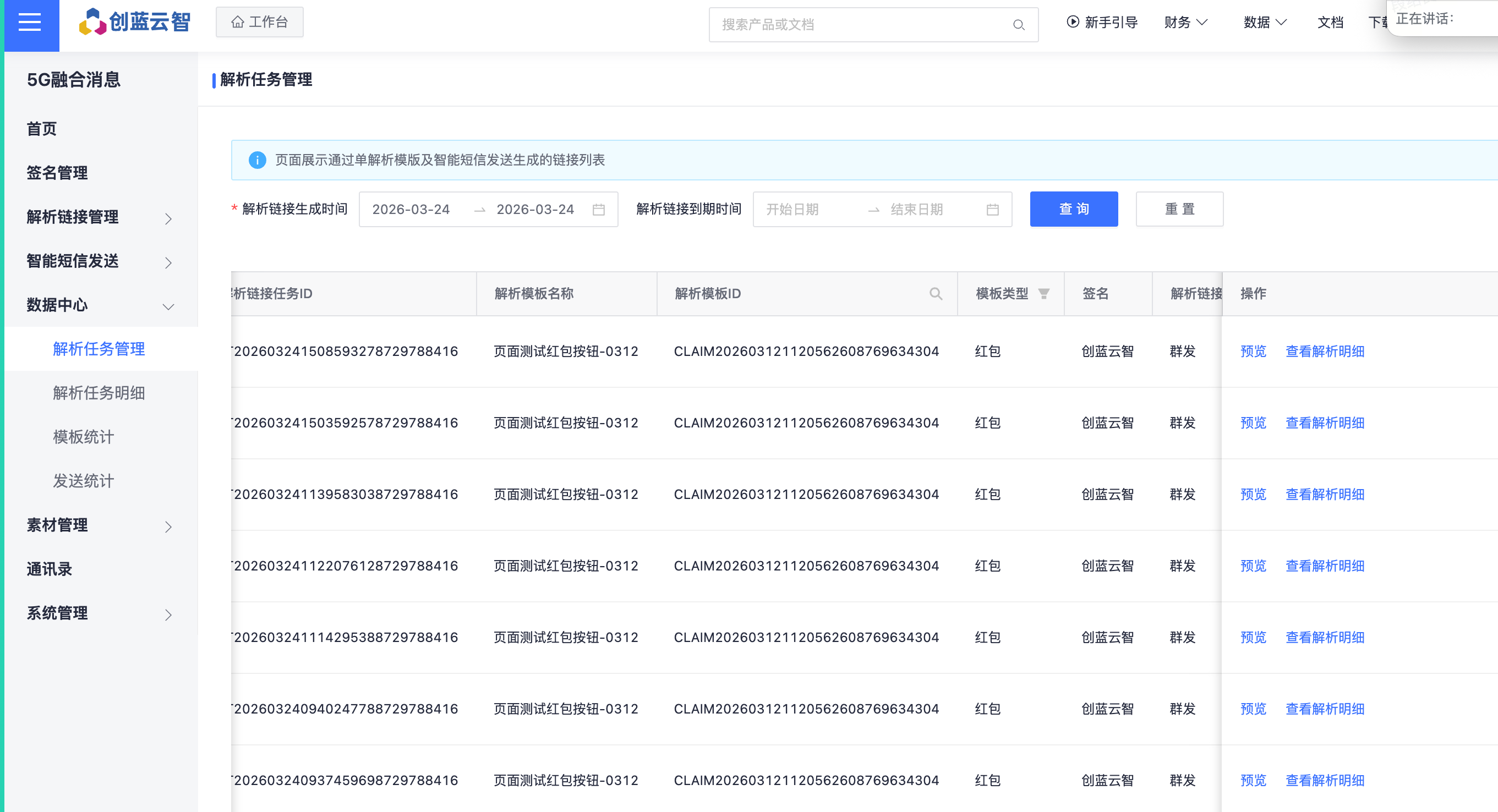 在“数据中心->解析任务管理”界面可以查看解析生成任务列表的详细信息;可以通过条件筛选搜索需要展示的解析生成任务列表。