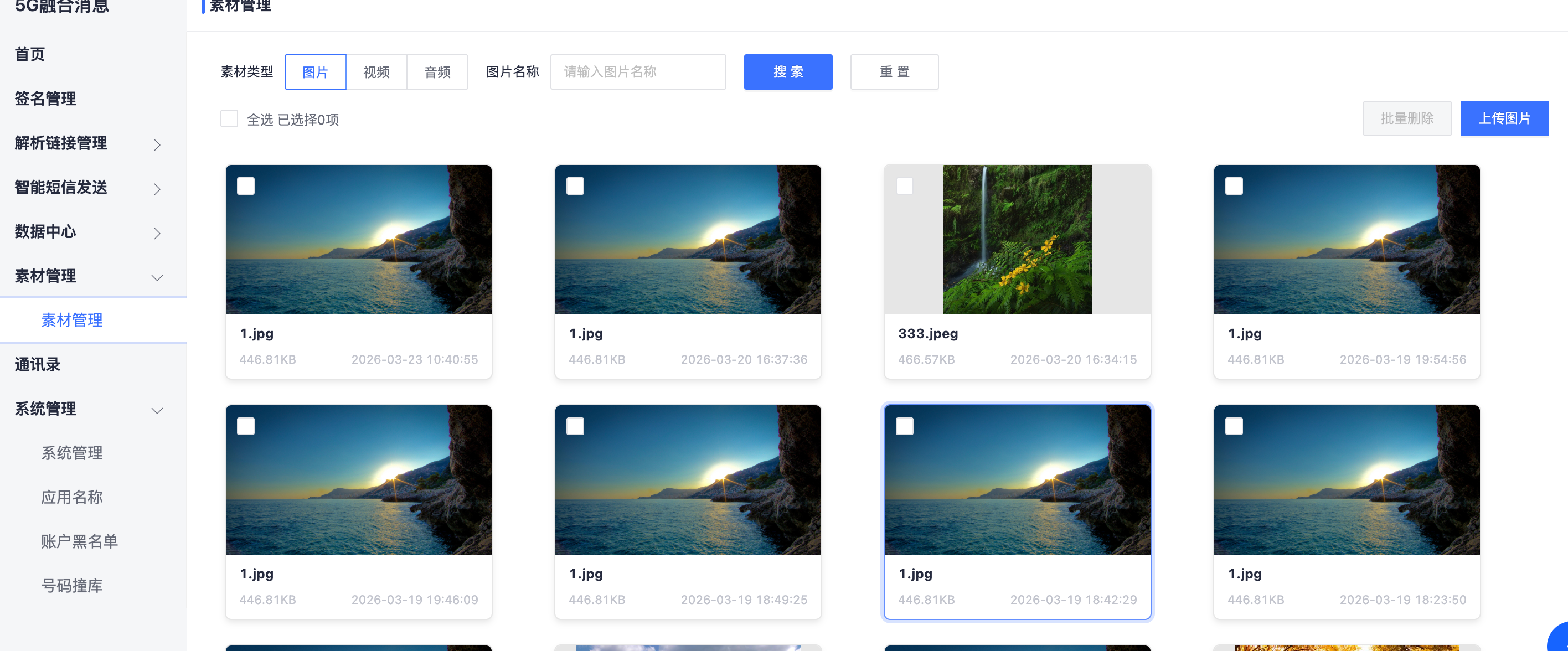 图片素材有创建图片素材库和标签分类管理功能,支持图片模式和列表模式查看,可以对图片进行状态筛选,和搜索图片名称找图片的功能,如下图所示: