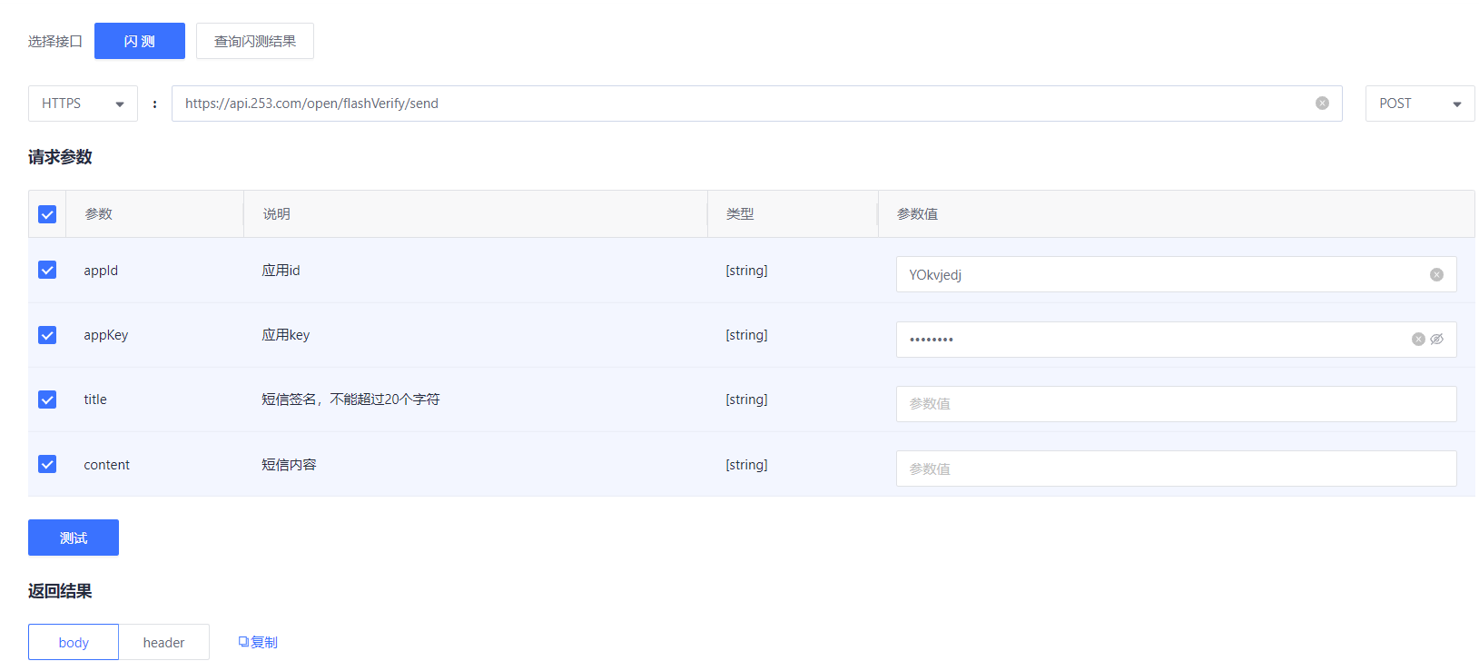 返回参数:闪测调用标识ID ,短信内容,闪测时间