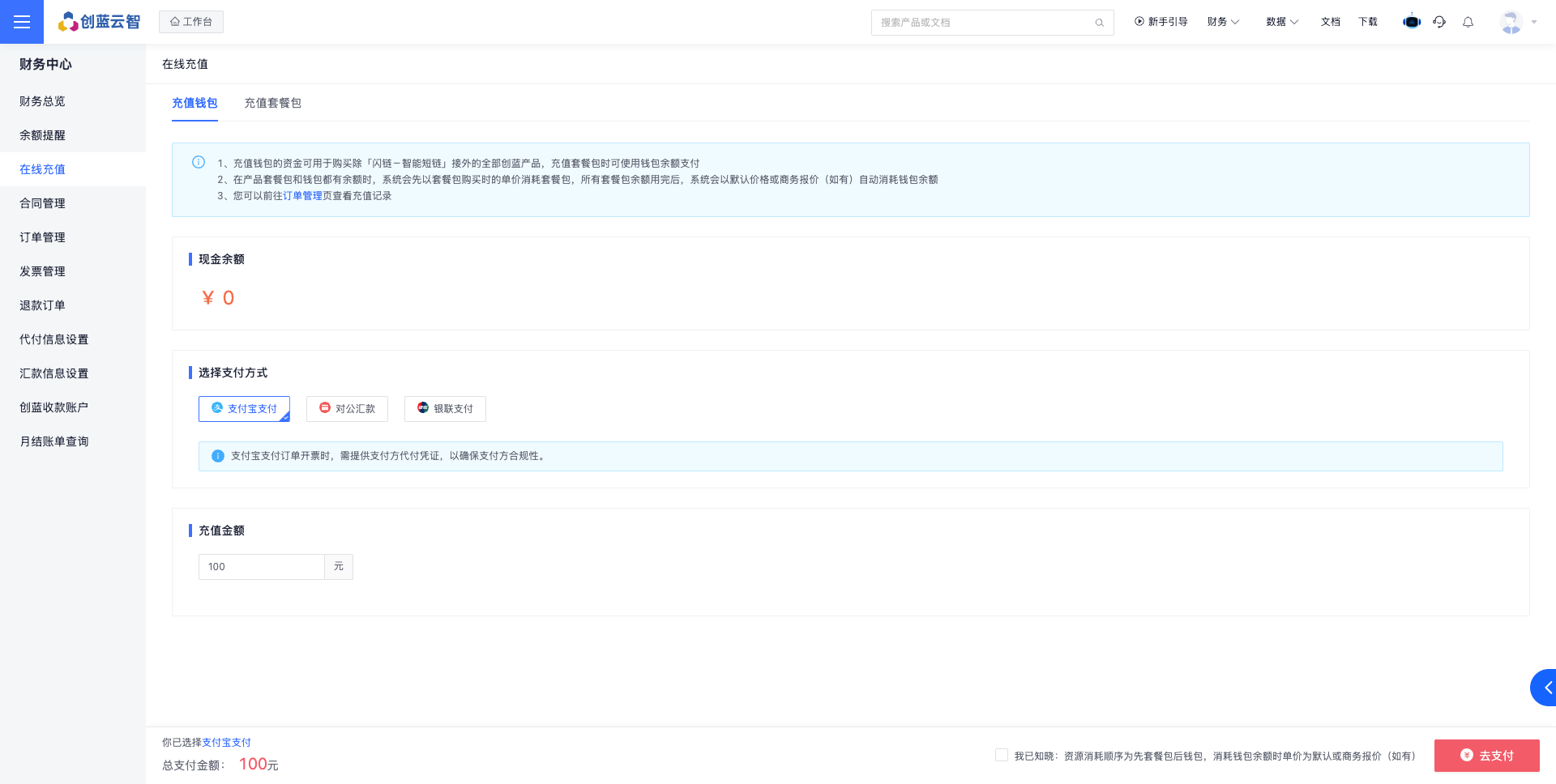 - 选择支付方式,支持支付宝,对公汇款,银联,钱包余额支付。若钱包余额不足,则需要先充值钱包余额再支付,或选择其他支付方式。