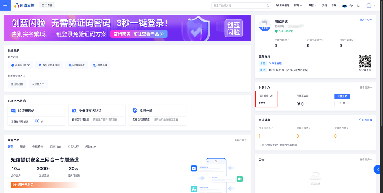 - 在右侧财务中心,「可用额度」即为当前钱包余额,支持显示隐藏。
