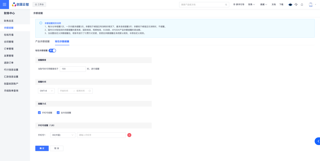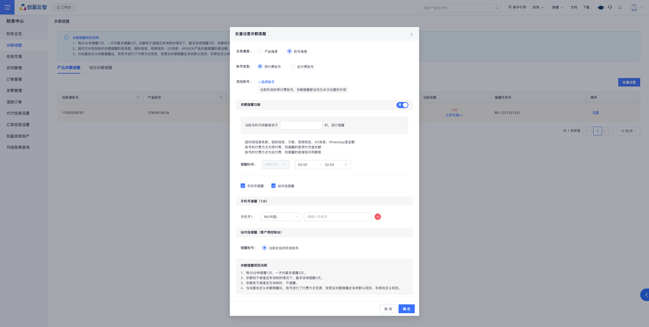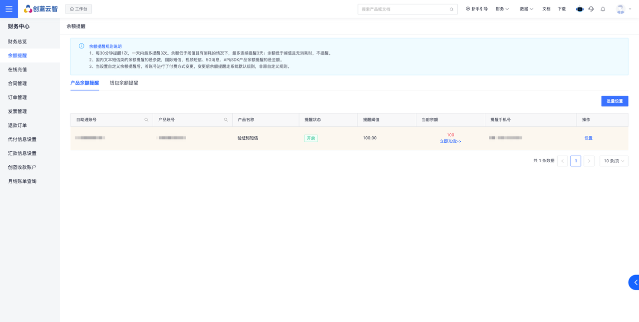 支持用户设置某个产品的余额提醒,当产品余额不足时,系统会自动通过短信和站内信提示。