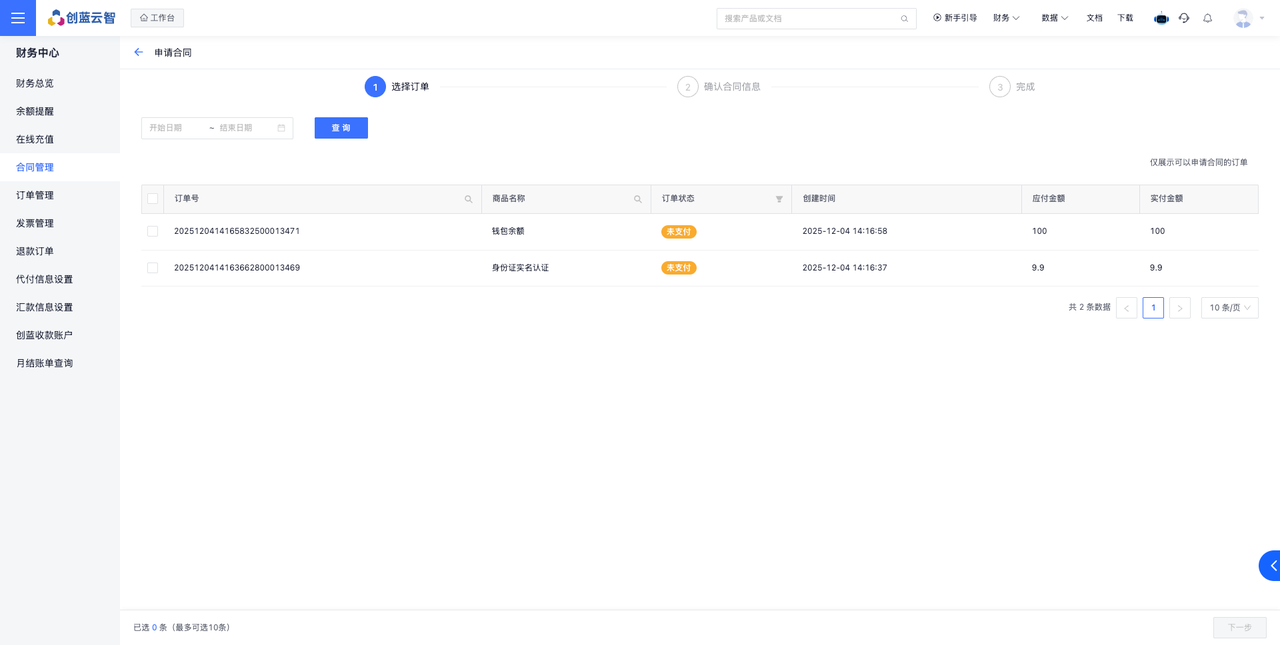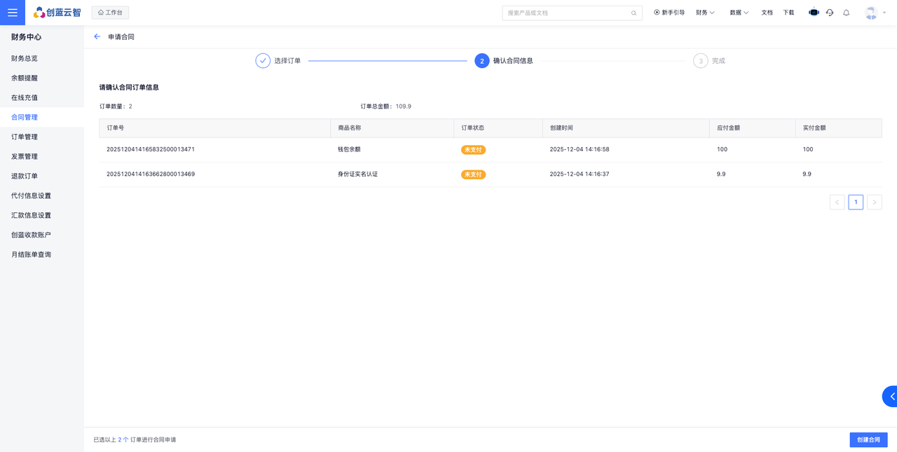 充值钱包余额与充值套餐包逻辑相同,都支持根据订单生成合同。