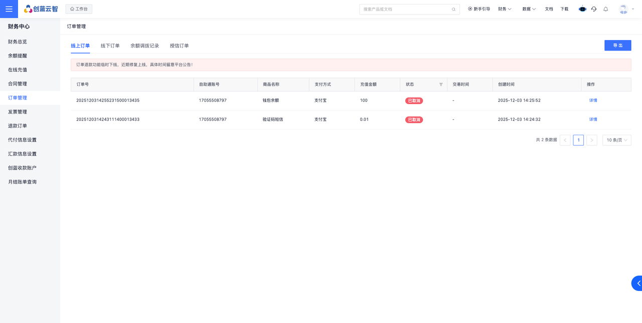 - 只有充值行为才会有订单产生,资金调拨不产生订单(充值钱包,充值套餐包会生成订单,使用钱包余额购买套餐包属于资金调拨,不生成订单,生成的记录可在「订单管理」-「余额调拨记录」查看)