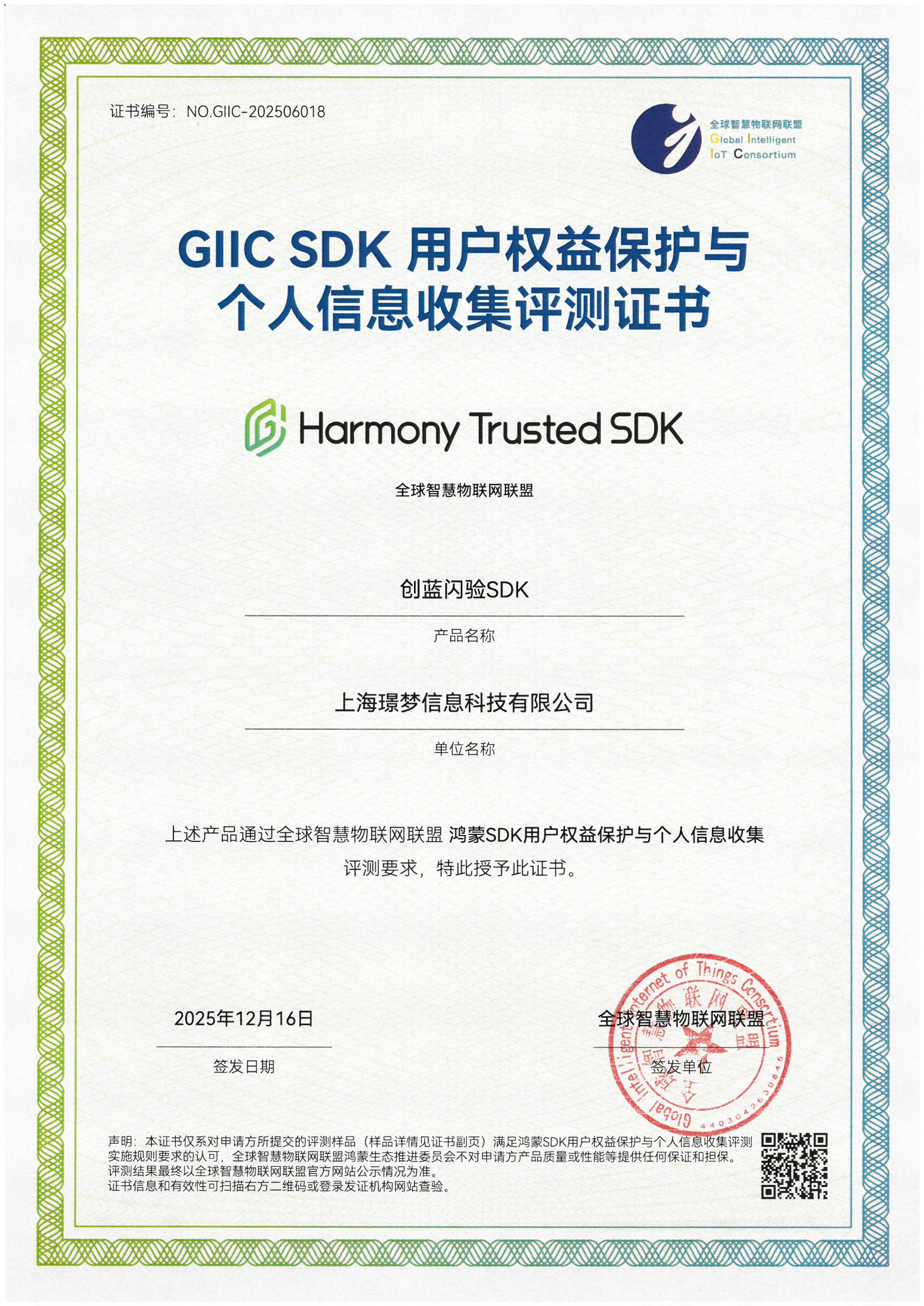 创蓝闪验SDK首批通过全球智慧物联网联盟(GIIC)“鸿蒙SDK用户权益保护与个人信息收集评测”要求,并获得相应证书。